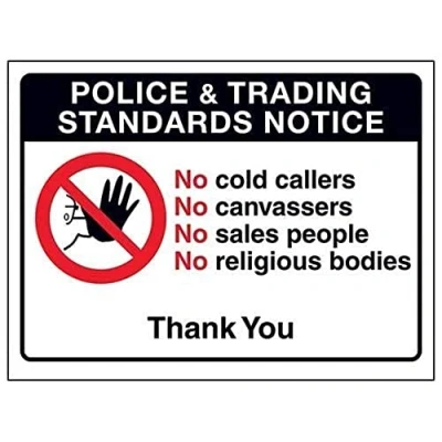 V Safety Trading Standards: No Cold Callers Or Sales People Sign 150mm x 100mm Self Adhesive Vinyl