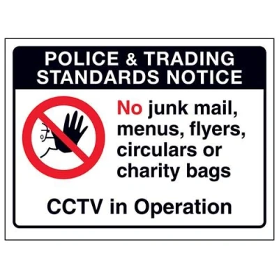 V Safety Trading Standards: No Junk Mail, Menus Or Flyers Sign 200mm x 150mm Self Adhesive Vinyl