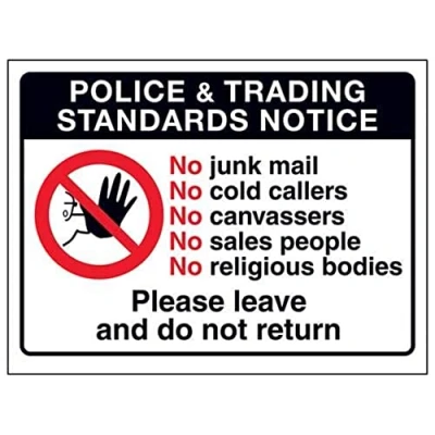 V Safety Trading Standards: No Junk Mail or Cold Callers Sign 150mm x 100mm Self Adhesive Vinyl