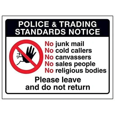 V Safety Trading Standards: No Junk Mail or Cold Callers Sign 200mm x 150mm Self Adhesive Vinyl