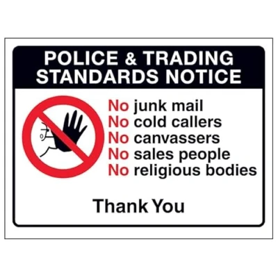 Junk Mail and Cold Caller Signs are the ideal solution for keeping unwanted post and callers away Help to prevent trespassing and junk mail and unsolicited flyers being posted Deter cold callers, religious organisations and sales people Bold enough to be effective, yet small enough to be discreet Available in self adhesive vinyl or face adhesive window stickers - perfect for internal or external use, Weight: 0.0220462262 Pounds, Manufacturer: VSafety