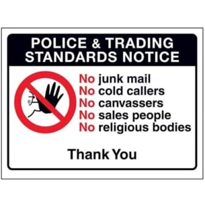 V Safety Trading Standards: No Junk Mail Sign 200mm x 150mm Self Adhesive Vinyl