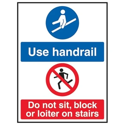 V Safety Use Handrail/Do Not Sit, Block Or Loiter On Stairs 150 x 200 mm Self Adhesive Vinyl Sign