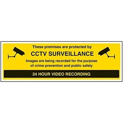 Helps to fulfil legal obligations to inform employees, visitors and the general public of potential hazards as per Health and Safety (Safety Signs & Signals) Regulations 1996 Conforms to EN ISO 7010:2012 - Warning signs feature a triangular symbol with a black pictogram and yellow background occupying at least 50% of the total sign area Landscape Orientation. Sign reads "These Premises Are Protected By CCTV Surveillance. Images Are Being Recorded For The Purpose of Crime Prevention and Public Safety. 24 Hour Video Recording" Highly durable Self Adhesive Vinyl material and screen printed message will stand the test of time Sign measures 450 x 150mm. Self Adhesive material will adhere securely to most surfaces