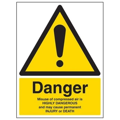 Helps to fulfil legal obligations to inform employees, visitors and the general public of potential hazards as per Health and Safety (Safety Signs & Signals) Regulations 1996 Conforms to EN ISO 7010:2012 - Warning signs feature a triangular symbol with a black pictogram and yellow background occupying at least 50% of the total sign area Portrait Orientation. Sign reads "Warning. Misuse Of Compressed Air Is Highly Dangerous And May Cause Permanent Injury Or Death" Highly durable Self Adhesive Vinyl material and screen printed message will stand the test of time Sign measures 300 x 400mm. Self Adhesive material will adhere securely to most surfaces
