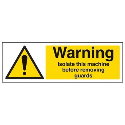 Helps to fulfil legal obligations to inform employees, visitors and the general public of potential hazards as per Health and Safety (Safety Signs & Signals) Regulations 1996 Conforms to EN ISO 7010:2012 - Warning signs feature a triangular symbol with a black pictogram and yellow background occupying at least 50% of the total sign area Landscape Orientation. Sign reads "Warning. Isolate This Machine Before Removing Guards" Highly durable Self Adhesive Vinyl material and screen printed message will stand the test of time Sign measures 300 x 100mm. Self Adhesive material will adhere securely to most surfaces