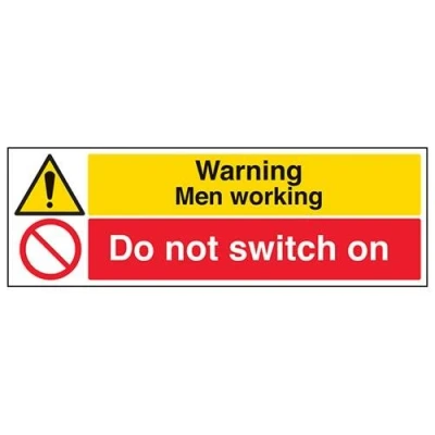 V Safety Warning Men Do Not Switch On Sign 600mm x 200mm 1mm Rigid Plastic