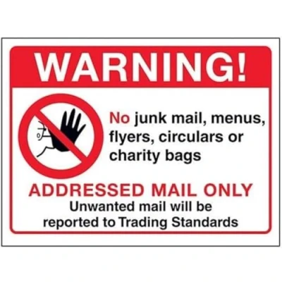 V Safety Warning! No Junk Mail, Addressed Mail Only Sign 200mm x 150mm Window Sticker