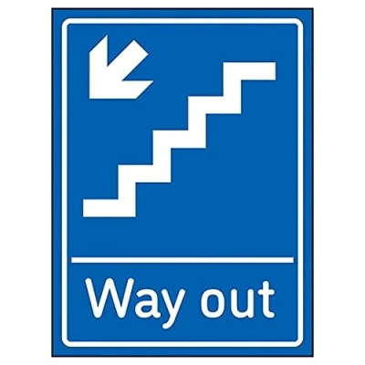 V Safety Way Out Arrow Down Stairs Left 150mm x 200mm Blue 1mm Rigid Plastic