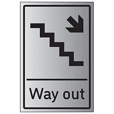 V Safety Way Out Arrow Down Stairs Right 150mm x 200mm 1.6mm Aluminium Effect Rigid Plastic