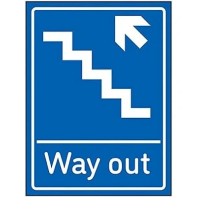 V Safety Way Out Arrow Up Stairs Left 200mm x 300mm Blue 1mm Rigid Plastic