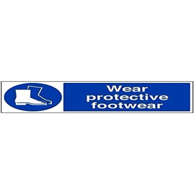 Helps to fulfil legal obligations to remind staff and visitors to wear the appropriate PPE when required to ensure personal safety as per Health and Safety (Safety Signs & Signals) Regulations 1996 Conforms to EN ISO 7010:2012 - Mandatory Signs feature a round symbol with a blue background of at least 50% of the total sign area with a white pictogram and text Landscape Orientation. Sign reads "Wear Protective Footwear" Highly durable Self Adhesive Vinyl material and screen printed message will stand the test of time Sign measures 600 x 200mm. Self Adhesive material will adhere securely to most surfaces