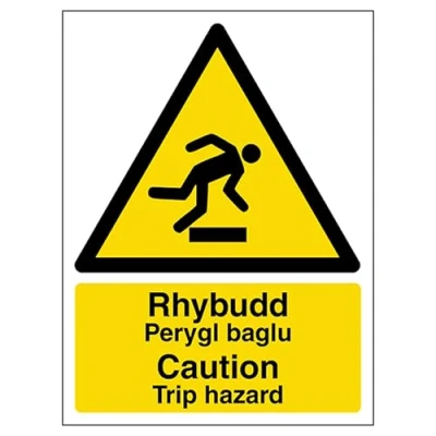 V Safety Welsh/English Caution Trip Hazard 150 x 200 mm 2mm 100% Recycled Rigid Plastic Sign
