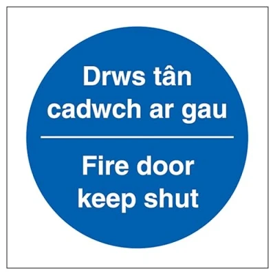 V Safety Welsh/English Fire Door Keep Shut 200 x mm Self Adhesive Vinyl Sign