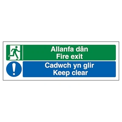 V Safety Welsh/English Fire Exit/Keep Clear 450 x 150 mm Self Adhesive Vinyl Sign