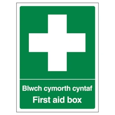V Safety Welsh/English First Aid Box Portrait 150 x 200 mm 2mm Super Tough Rigid Plastic Sign