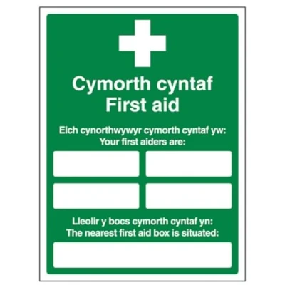 V Safety Welsh/English Your First Aiders Are Nearest Aid Box 450 x 600 mm 2mm Rigid Plastic Sign