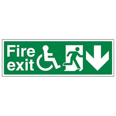 V Safety Wheel Chair Fire Exit with Text Arrow Down 450 x 150 mm 3mm Aluminium Composite Sign