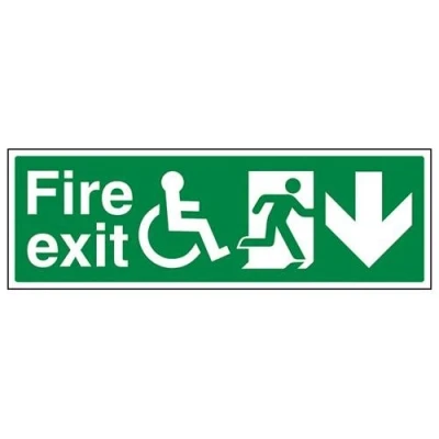 V Safety Wheel Chair Fire Exit With Text Arrow Down Sign 450mm x 150mm Self Adhesive Vinyl