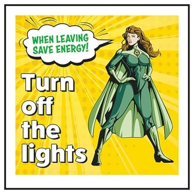 V Safety When Leaving Save Energy! Turn Off The Lights Superwoman 100 x mm Self Adhesive Vinyl Sign
