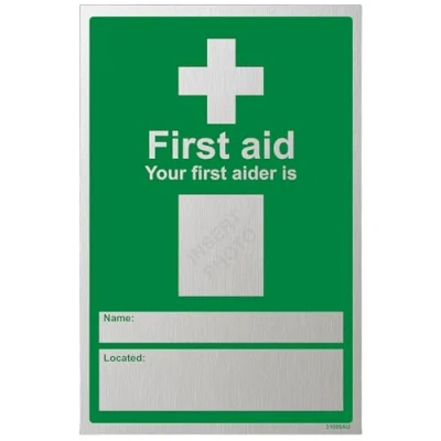 V Safety Your First Aider Is: 200 x 300 mm Self Adhesive Vinyl Aluminium Effect Sign