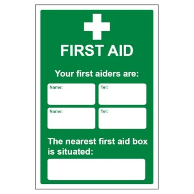 V Safety Your First Aiders Are Nearest Aid Box 400 x 600 mm Glow In The Dark 1mm Rigid Plastic Sign