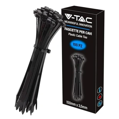 V-TAC WIRING TIES: Pack of 100 Plastic Cable Ties measuring 2.5mm x 150mm for tightening, winding, holding cables and wires. Strap colour: black. Product details: Plastic self-locking cable ties for wiring, with width 2.5 mm and length 150 mm. The product is made of plastic polymer. The product is characterized by a high fire resistance of type UL94 V-2 and an operating temperature ranging from -40°C to +85°C. DURABLE AND DURABLE: The material used for these cable ties offers high resistance to corrosion and against UV rays. SELF-LOCKING TIES: Self-locking cable ties, sturdy and strong with serrated teeth to loosen resistance, lab tested and applied to durable cables for functionality and quality. Many applications: Ideal for professional or home use. Suitable for cars, pipes, gardens, apartments and offices. Can be used to hold various kinds of cables such as computer cable, decorative lamp, TV cable, Christmas lighting cable, LED light band, USB cable, outdoor lighting, solar lamp., Weight: 0.0881849048 pounds, Manufacturer: V-TAC