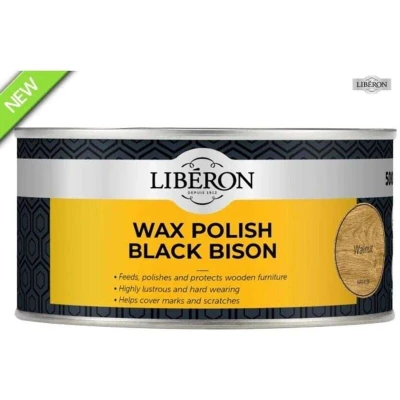 General description Liberon Black Bison Wax Paste Walnut is a premium product designed to nourish and protect all types of wood, including lacquered and French polished surfaces. This wax paste is made from a blend of high-quality waxes, including carnauba wax, and is known for its pleasant aroma. It provides a durable, high-gloss finish that enhances the natural beauty of wood while preventing drying out and covering scratches and marks. Safe for use on toys, it is ideal for both antique and modern furniture. Technical specifications Dry Time: Minimum 20 minutes Coverage: 10-12 m² per litre Location: Interior Application: Brush, cloth, or steel wool Tool Cleaning: White Spirit or Wax & Polish Remover Installation Apply a small amount of wax using a brush, cloth, or steel wool Spread evenly over the surface Allow to dry for at least 20 minutes Buff to achieve a high-gloss finish Usage Use on furniture, antiques, and new wood surfaces Feeds, polishes, and protects wood surfaces Helps