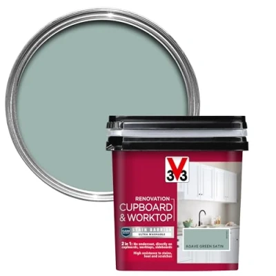 V33 Renovation Cupboard & Worktop Paint Agave Green 750ml No Undercoat Durable Finish High Resistance To Water, Stains Scratches Washable Resistant Cleaning Products