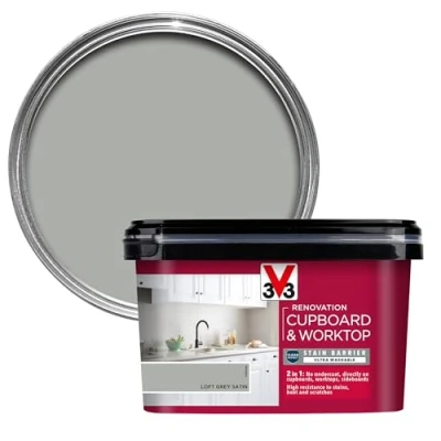 V33 Renovation Cupboard & Worktop Paint Loft Grey 2L No Undercoat Durable Finish High Resistance To Water, Stains Scratches Washable Resistant Cleaning Products