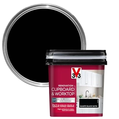 V33 Renovation Cupboard & Worktop Paint Quartz Black 750ml No Undercoat Durable Finish High Resistance To Water, Stains Scratches Washable Resistant Cleaning Products