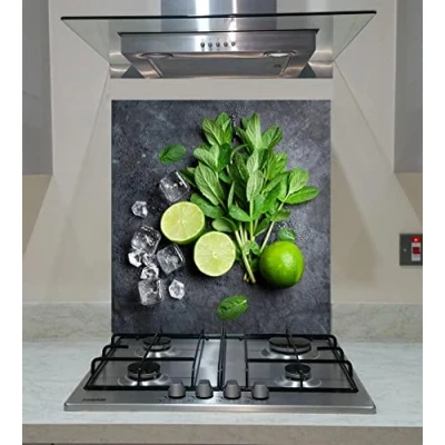 Va Art Glass Splashback Tempered Panel Kitchen with a mint lime and ice on the stone table ANY SIZE (wide 60 x height /cm)