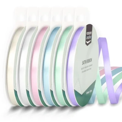 VERSATILE SATIN RIBBON - Add a touch of elegance to your gifts, decorations, and other creative projects with these double-sided satin ribbons in 6 beautiful baby shower and communion colours DOUBLE-FACED AND GLOSSY - The doubled-sided, smooth, shiny satin offers a luxurious look and feel, perfect for personalising your creations in style. Its stitched edges give it a neat finish RIBBONS FOR CRAFTING - Vaessen Creative satin ribbons are available in many colours, widths, and lengths. The ribbons are available individually, but also in handy bundles for various themes HIGH QUALITY - Made from high-quality materials, this durable and double-sided satin ribbon won't fray when cut. The vibrant colours do not fade, but remain bright DIMENSIONS - This baby shower pack includes 6 satin ribbons in 6 colours: antique white, white, pastel pink, pastel blue, pastel green, lavender. The ribbons measure 0.24" x 32.8 ft (6 mm x 10 m)