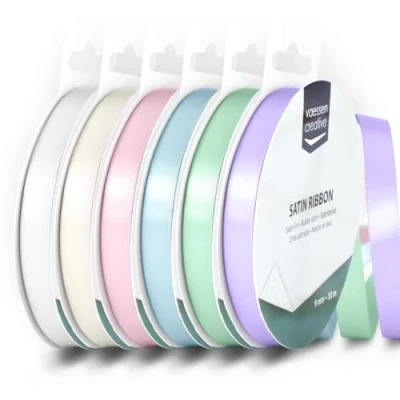 VERSATILE SATIN RIBBON - Add a touch of elegance to your gifts, decorations, and other creative projects with these double-sided satin ribbons in 6 beautiful baby shower and communion colours DOUBLE-FACED AND GLOSSY - The doubled-sided, smooth, shiny satin offers a luxurious look and feel, perfect for personalising your creations in style. Its stitched edges give it a neat finish RIBBONS FOR CRAFTING - Vaessen Creative satin ribbons are available in many colours, widths, and lengths. The ribbons are available individually, but also in handy bundles for various themes HIGH QUALITY - Made from high-quality materials, this durable and double-sided satin ribbon won't fray when cut. The vibrant colours do not fade, but remain bright DIMENSIONS - This baby shower pack includes 6 satin ribbons in 6 colours: antique white, white, pastel pink, pastel blue, pastel green, lavender. The ribbons measure 0.35" x 32.8 ft (9 mm x 10 m)
