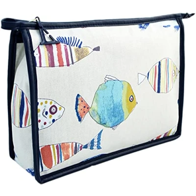 Fancy fish large holdall washbag British made: manufactured in our UK factory to a high quality Waterproof faux leather lining and trim, big capacity, ideal travel toiletry bag 26 x 20 x 8cm with two internal pockets Matching products Available for a perfect travel set Item display weight: 0.21 kilograms