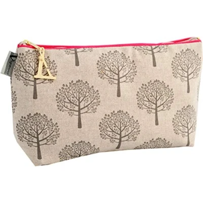 Beautiful grey tree print on a linen mix with a pop of pink British made Manufactured in our UK factory to a high quality. Waterproof lining 26cm x 16cm x 8cm Matching products Available for a perfect travel set