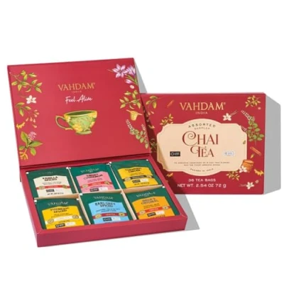 ASSORTED CHAI TEA GIFT SET - Step into a world of tea enchantment with our exclusive & premium Chai Tea Sampler Gift Set. Savor a symphony of flavors with our diverse tea collection featuring classics like Original Masala Chai Tea, Sweet Cinnamon Masala Chai Tea, & Earl Grey Masala Chai Tea, alongside the golden warmth of Turmeric Spiced Herbal Tea, the luxurious indulgence of Vanilla Spiced Chai Tea, & the invigorating blend of Turmeric Ginger Herbal Tea. A BRAND WITH A BILLION DREAMS - VAHDAM India is one of India's largest digitally native, global brands, shipping to over 3 million customers across 130+ countries. With an aim to bring India's finest Teas, Brew Ware, Spices & Herbs to consumers across the world under a home-grown, sustainable label with a strong commitment to people and planet. ETHICAL, DIRECT & FAIR-TRADE - Our Innovative Supply Chain Model Ensures You Get The Freshest Cup Of Tea & Our Farmers Get A Better Price For Their Produce. 1% Of Our Revenue Is Redirected Towards The Education Of Our Tea Growers' Children With Our Social Initiative, Teach Me, Simply Wish To Honor This Aspiration. WE CARE FOR PEOPLE & PLANET - We Are Now A Proudly Carbon-Neutral & A Plastic-Neutral BRAND. We Measure Our Overall Carbon & Plastic Footprint & Offset It Via Our Investments In Environment Sustainability Initiatives In India.