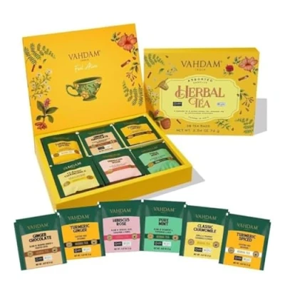 ASSORTED HERBAL TEA GIFT SET - Level up your gift-giving with VAHDAM India's Herbal Tea Sampler Gift Set. This thoughtfully curated collection presents 6 exquisite herbal tea variants, each meticulously crafted for an unparalleled tea experience. Delight in the flavors with 6 tea bags of each blend, making it a perfect choice for those who appreciate the art of fine tea. 6 EXOTIC HERBAL TEAS - Embark on a sensory journey with our Herbal Tea Collection with warm Golden Turmeric Spice, invigorating Turmeric Ginger blend, fresh Pure Mint, tranquil Classic Chamomile, vibrant Hibiscus Rose and strong Vedic Kadha Herbal Tea. Each tea promises a premium, handpicked experience. A BRAND WITH A BILLION DREAMS - VAHDAM India is one of India's largest digitally native, global brands, shipping to over 3 million customers across 130+ countries. With an aim to bring India's finest Teas, Brew Ware, Spices & Herbs to consumers across the world under a home-grown, sustainable label with a strong commitment to people and planet. ETHICAL, DIRECT & FAIR-TRADE - Our Innovative Supply Chain Model Ensures You Get The Freshest Cup Of Tea & Our Farmers Get A Better Price For Their Produce. 1% Of Our Revenue Is Redirected Towards The Education Of Our Tea Growers' Children With Our Social Initiative, Teach Me, Simply Wish To Honor This Aspiration. WE CARE FOR PEOPLE & PLANET - We Are Now A Proudly Carbon-Neutral & A Plastic-Neutral BRAND. We Measure Our Overall Carbon & Plastic Footprint & Offset It Via Our Investments In Environment Sustainability Initiatives In India.