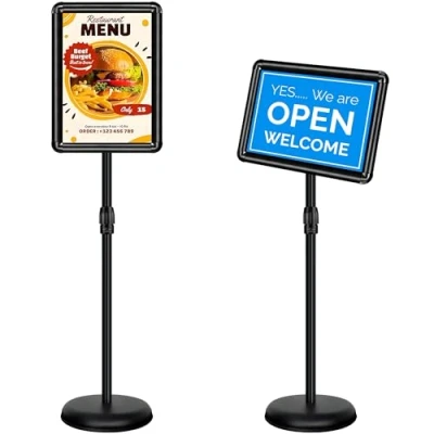 VAIIGO A4 Sign Stand Adjustable Poster Aluminum Snap Frame Menu Replaceable Advertising Rack Floor Display Stands with Safety Corner and Stable Round Base (Black, A4)