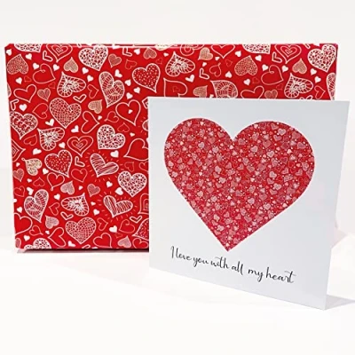 Valentines Card with 2 sheets of Gift Wrap. Heart Design. 150x150mm, Wrap 500 x 700mm. Valentine's Red Envelope. Verse inside. Printed and Packed in UK.