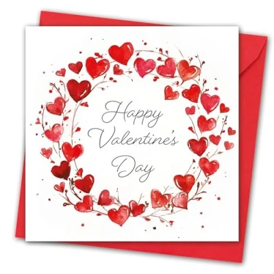 Valentines Card. Wreath Design. Eco friendly. 148mm Square. Valentine's Card with Red Envelope. Made in UK