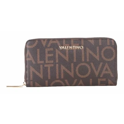 ORGANISATION — Featuring 16 slots for credit, debit, or business cards, along with two side pockets, two banknote compartments, two slip pockets, and a dedicated zippered coin section to keep your valuables neatly organised. DESIGN — This wallet showcases a sophisticated logo pattern in a chic brown and beige colour scheme, accented by elegant gold-tone hardware that provides a modern and stylish aesthetic for any occasion. DIMENSIONS — Perfectly sized for everyday convenience, measuring approximately 19 cm in width, 10 cm in height, and 2.5 cm in depth, while maintaining a lightweight feel of only 190 grams for easy handling. QUALITY — Crafted with a high-quality grained finish, the exterior is made from 100% polyurethane and the interior from 100% polyester, ensuring durability and a premium feel for your daily financial essentials. SECURE CLOSURE — The wallet is designed with a reliable zipper closure to keep all your belongings safe and secure, while it comes presented in a VALENTINO gift box, making it an ideal choice for gifting.