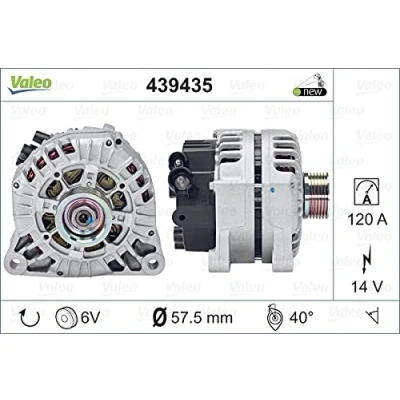 VALEO 439435 Alternator Charge current: 120 Amp Grooves: 6 grooves Pulley diameter: 57,5 mm Voltage: 14 V Rotation direction: CLOCKWISE