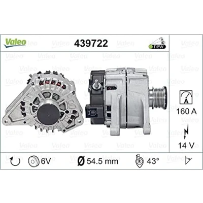 VALEO 439722 Alternator Charge current: 160 Amp Grooves: 6 grooves Pulley diameter: 54,5 mm Voltage: 14 V Rotation direction: CLOCKWISE