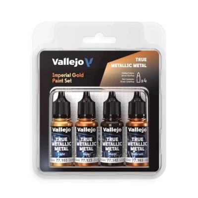 Transform your projects with the True Metallic Metal IMPERIAL GOLD paint set, designed to deliver a brilliant and professional finish with every application, Made in Spain Each set includes 4 essential tones: BASE, LIGHT, SHADE, and AIRBRUSH, ensuring a complete solution to achieve the desired metallic effect in your creations Made in Spain ORGANIZATION AND COMFORT: The 4-color sets enable an orderly and efficient workflow, making it easy to choose the perfect shade for every detail Consistent and Reproducible Results with the BSL System, perfect for artists seeking quality and precision in every project, Made in Spain ADAPTABLE TO ANY PAINTING STYLE, this set is perfect for both beginners and professionals, ensuring that every creation shines with a spectacular finish, Made in Spain, Manufacturer: Vallejo