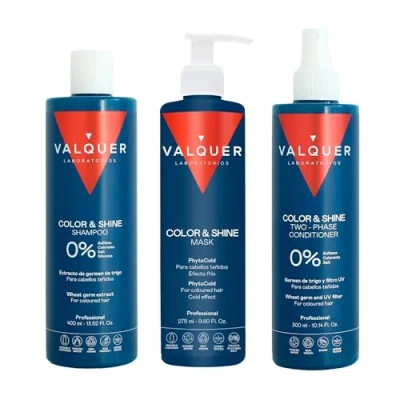 COLOR & SHINE ENHANCING PACK. Includes a 400 ml Color-Boosting Shampoo, 275 ml Mask and 300 ml Two-Phase Conditioner. Specially formulated to maintain the vibrancy of colour-treated hair with a 0% Formula free from sulfates, colourants and salt. COLOR & SHINE SHAMPOO. Enhances the colour and brightness of dyed hair with a 0% Formula free from sulfates, silicones and salt. Revives and prolongs colour while delivering a healthy, long-lasting shine. ICE HAIR MASK. Formulated with Wheat Germ Extract, Blueberry and Frescolat, it repairs dry or damaged hair through deep hydration. With 93% natural ingredients, it protects, restores and conditions the hair while boosting softness and shine. TWO-PHASE CONDITIONER. Revives and enhances hair colour with a no-rinse formula that delivers instant detangling. Helps prevent irritation and itching while providing exceptional softness, leaving the hair silky, smooth and residue-free. MADE IN SPAIN. Product created and manufactured in Spain using Valquer's proprietary formulation. Laboratory and manufacturer certified according to ISO 9001, ISO 14001, ISO 22716, and AENOR R&D&I standards.