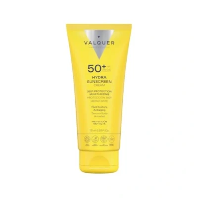 SPF 50+ 360° PROTECTION. Provides complete protection against UVA, UVB, infrared (IR), and blue light (HEV) rays, keeping your skin shielded and in optimal condition. Helps prevent sun-induced aging and long-term skin damage. DEEP HYDRATION. Formulated with high molecular weight Hyaluronic Acid, Hydra Sunscreen delivers intense, long-lasting hydration that improves skin texture, elasticity, and softness. ANTI-AGING FORMULA. Enriched with Carnosine and Vitamins C and E, it helps reduce visible signs of aging by stimulating collagen production. Improves skin firmness, radiance, and overall youthful appearance. NON-GREASY & RESIDUE-FREE. Its lightweight texture absorbs quickly without leaving any trace, providing a clean, transparent, and comfortable finish, perfect for daily use under makeup or on its own. MADE IN SPAIN. Product created and manufactured in Spain under Valquer's own formulation. Laboratory and manufacturer certified according to standards: ISO 9001, ISO 14001, ISO 22716 and AENOR R+D+I.