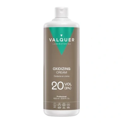 VALQUER OXIDIZING. Oxygenated emulsion with a concentration of 20 volumes (6%). Enhances color development when mixed with hair coloring cream. VEGAN FORMULA. Innovative formula with osmosis (deionized) water and stabilized hydrogen peroxide, designed for high-quality permanent hair coloring. CREAMY TEXTURE. Allows for uniform mixing and precise application, improving product control and preventing dripping during the technical process. PROFESSIONAL USE. Designed to be applied by professional hairdressers during technical hair processes. Ensures a safe, effective, and controlled experience. MADE IN SPAIN. Product created and manufactured in Spain using Valquer's proprietary formulation. Laboratory and manufacturer certified according to ISO 9001, ISO 14001, ISO 22716, and AENOR R&D&I standards.