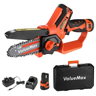 ValueMax Mini Chainsaw, 4" Cordless Electric Chain Saw with 2 Batteries 1H Quick Charger, One Handed 12V Small Garden Portable for Pruning Trees Branch Wood Cutting