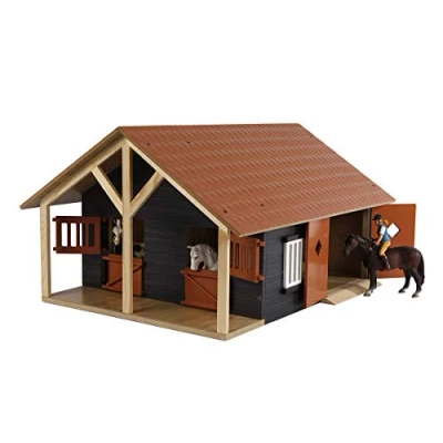 Stable with 2 x boxes and storage space (workshop, barn) for hay and straw. The horse stable is made of wood and has a natural look. Specially made for Schleich or Bully animals in 1:24 scale. Roof and doors can be opened and thus ensure realistic play. Horses and accessories are not included., Manufacturer: Van Manen
